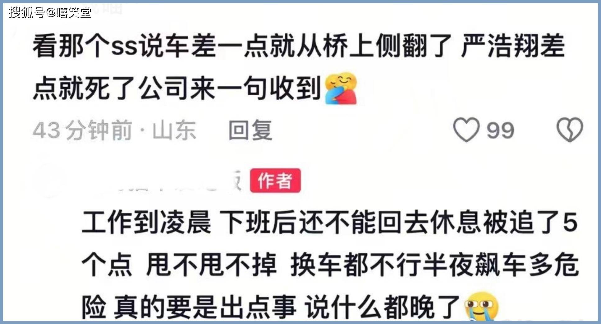 原来,严浩翔忙到凌晨时分下班,就在回家途中,居然被十二辆车追了五个小时,一直折腾到天亮。